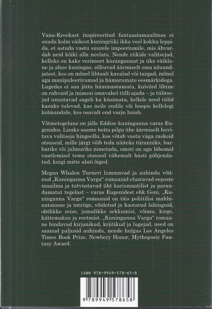 Megan Whalen Turneri lummavad ja auhindu võitnud „Kuninganna Varga“ romaanid elustavad eeposte maailma ja tutvustavad üht karismaatilist ja parandamatut tegelast – varas Eugenidest ehk Geni. „Kuninganna Varga“ romaanid on täis poliitilisi mahhinatsioone ja intriige, võidetud ja kaotatud lahinguid, ohtlikke reise, jumalikke sekkumisi, võimu, kirge, kättemaksu ja reetmist.